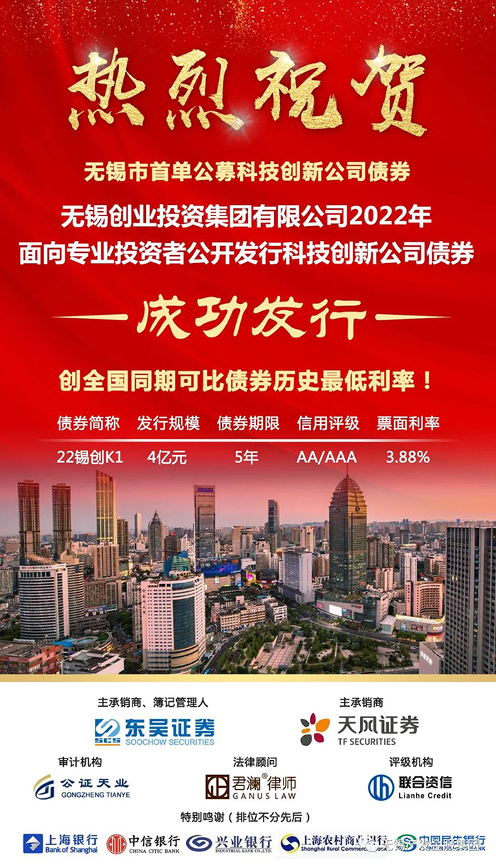 無錫創投集團成功發行無錫市首單公募科技創新公司債券
