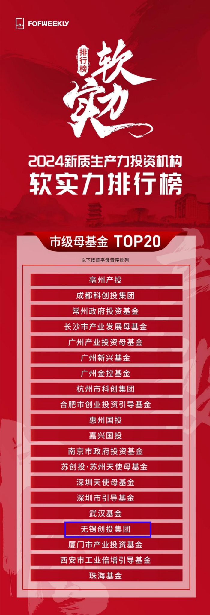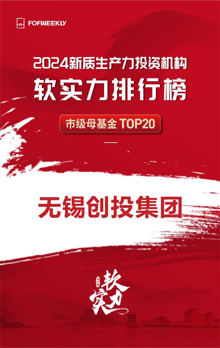 近日,《母基金周刊》(FOFWEEKLY)公布其年度排名“2024新質生產力投資機構軟實力排行榜”,無錫創投集團榮登“2024新質生產力投資機構軟實力排行榜—市級母基金 TOP20”。